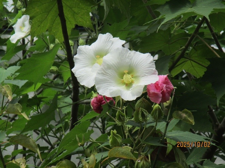 Bunga Suifuyō (Hibiscus mutabilis) telah mekar.